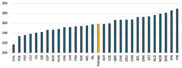 In particolare, l’ultima indagine PIAAC del 2023 ha raccolto risultati eterogenei, evidenziando grandi disparità tra il livello di competenze degli adulti appartenenti ai diversi Paesi presi in considerazione. Come è possibile osservare nel seguente grafico, infatti, le migliori performance sono state registrate in Finlandia, Giappone e Svezia, le quali hanno raggiunto un punteggio superiore alla media OCSE del 10%, nonché del 25% rispetto all’ultima Nazione classificata (il Cile). In questo scenario, l’Italia si è posizionata sotto la media OCSE come quinto Paese con il punteggio minore.