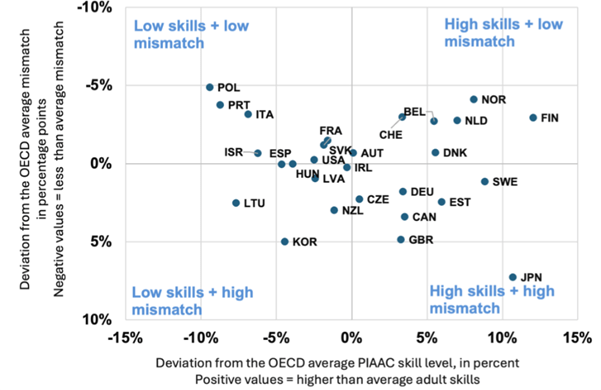 A fronte di ciò, si apprende non solo la necessità di promuovere capillarmente l’offerta di programmi di formazione per adulti (sia di upskilling che di reskilling) sul territorio e di incentivarne la frequentazione, ma anche di fornire più servizi di orientamento per giovani-adulti e programmi di studio in linea con le oscillazioni del mercato. Affinché riforme strutturali di questo genere vengano implementate, tuttavia, è essenziale conoscere innanzitutto le performance dei singoli Paesi nelle due dimensioni sinora considerate: ovvero, il livello di competenza degli adulti lavoratori e la percentuale di mismatch con il mercato del lavoro. A tal proposito, il grafico sottostante mostra i dati raccolti dall’indagine PIAAC del 2023.