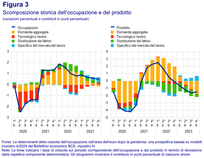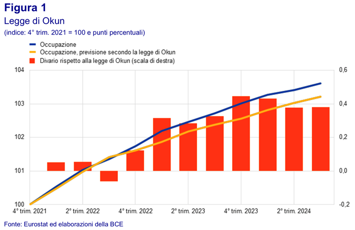 Nel Bollettino si legge infatti che, a partire dalla fase post-Covid, nei paesi dell’UE la crescita dell’occupazione ha superato in misura significativa la crescita dell’attività economica (cfr. Figura 1). Si tratta di uno scenario inedito, che si discosta da una consolidata evidenza empirica, nota come “legge di Okun”, secondo cui la crescita dell’occupazione aumenta a circa la metà del tasso di crescita del PIL in termini reali (stime per l’area euro).
