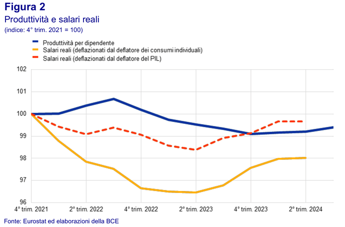 Uno dei fattori ad aver contribuito significativamente allo scollamento tra la crescita dell’occupazione e quella del prodotto è stato il calo dei salari reali all’inizio della crisi energetica. L’aumento dell’inflazione verificatosi in questo contesto ha infatti determinato una riduzione del valore reale delle retribuzioni, poiché l’adeguamento dei salari nominali si è verificato con un certo ritardo. È interessante notare che inizialmente la flessione dei salari reali è stata maggiore della riduzione della produttività (cfr. Figura 2).
