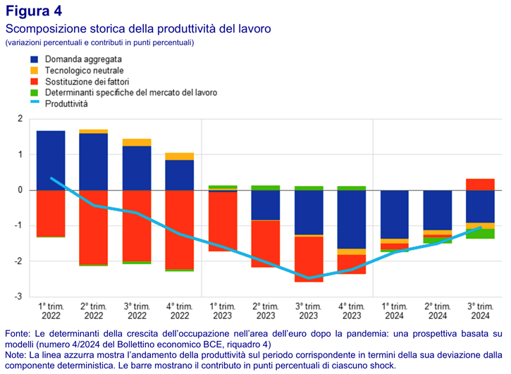 Come evidenziano i dati più recenti sul 2024 (cfr. Bollettino economico BCE), con la normalizzazione dei prezzi dell’energia e dei beni intermedi e le variazioni dei tassi di interesse reali, questa dinamica sta mostrando segni di attenuazione. Tuttavia, per consolidare questo miglioramento, sarà importante un recupero degli investimenti e un utilizzo più bilanciato dei diversi fattori di produzione, in modo da sostenere la crescita della produttività mantenendo i positivi livelli occupazionali raggiunti. Un mix equilibrato degli input produttivi è la chiave per uscire dal circolo vizioso della scarsa produttività e dei bassi salari e stimolare una crescita economica realmente sostenibile.
