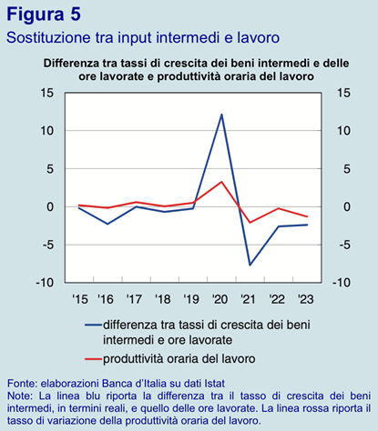 Nella Figura 5, la linea blu rappresenta la differenza tra il tasso di crescita dei beni intermedi (in termini reali) e quello delle ore lavorate, mentre la linea rossa indica la produttività oraria del lavoro. Quando la linea blu registra il forte calo, indicando un incremento dell’utilizzo del fattore lavoro rispetto all’impiego di beni intermedi, la linea rossa mostra una contrazione, segnalando una diminuzione della produttività del lavoro.