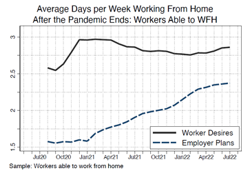 La recente ricerca del NBER si concentra poi sulla distribuzione geografica dei lavoratori che lavorano, interamente o parzialmente, da remoto, tema che era già stato trattato da un precedente paper del medesimo istituto (per un breve commento, vedi D. Porcheddu, L’impatto del lavoro da remoto sulla geografia delle città: spunti dal caso americano, Bollettino ADAPT n. 33/2021). Coerentemente ai risultati contenuti all’interno dello stesso, si registra come la percentuale di lavoratori da remoto sia, sin dall’inizio del periodo pandemico, molto più alta nelle grandi città rispetto ai piccoli centri. I ricercatori del NBER avevano decretato come questa circostanza fosse principalmente dovuta alla maggiore percentuale di lavoratori residenti in zone urbane attivi nella produzione dei cosiddetti “Skilled Scalable Services” ossia attività che presuppongono il massiccio uso di tecnologia informatica e un elevato livello di competenze da parte dei lavoratori coinvolti.