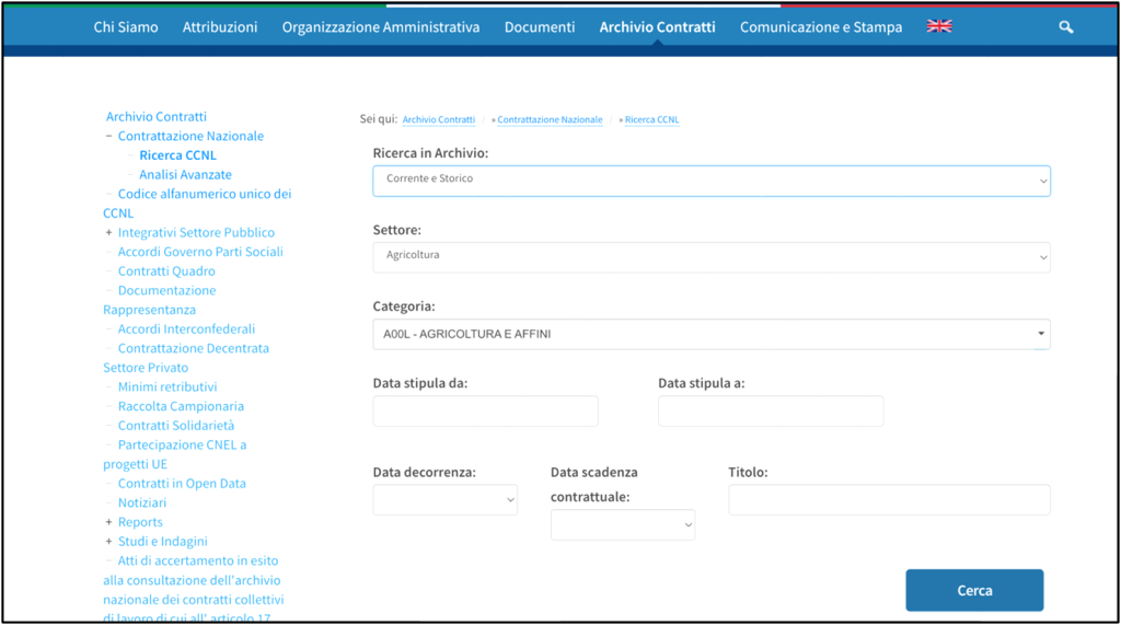 Una volta trovati il settore e la categoria corrispondenti all’attività economica d’interesse, è possibile interrogare la banca dati per trovare i CCNL di riferimento in questo modo (figure 6, 7 e 8):