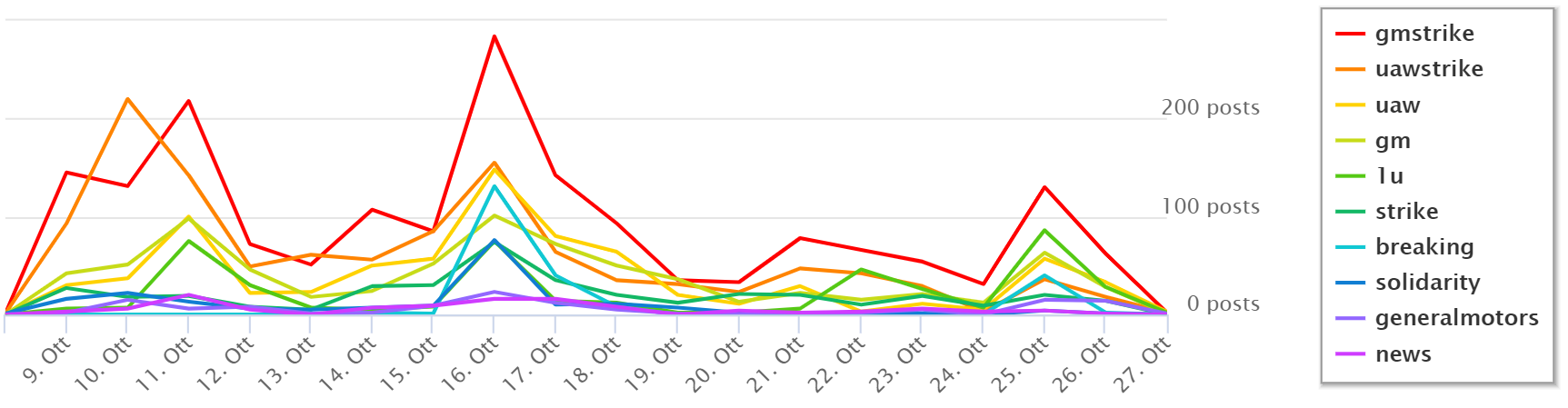 Il sindacato ha comunicato costantemente e rapidamente con i membri. Oggetto dei messaggi sui social, non solo i contenuti del contratto, ma anche le tappe del processo di voto, Il tutto tamponando preventivamente l’azione dei sociali on-line. Solo dall’8 al 27 ottobre il GM strike ha fatto registrare più di 39.000 tweet, con un’ampia copertura mediatica da parte di tutti i grandi player dell’informazione. Picco d’attenzione il 16 ottobre, quando il CEO di GM Mary Barra si è aggiunta al tavolo facendo presagire l’approssimarsi di un accordo.