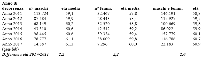 Questa impostazione ha subìto delle modifiche nei requisiti d’accesso: le quote (ovvero la somma tra l’età e l’anzianità), l’aggiunta della c.d. finestra mobile e l’incremento derivante dall’aggancio automatico all’attesa di vita. Fino alla riforma Fornero del 2011 che ha inglobato nel requisito anagrafico tanto l’anno della finestra mobile (il tempo necessario ad esercitare il diritto una volta maturati i requisiti) quanto gli incrementi periodici dipendenti dalla maggiore aspettativa di vita. In più la nuova disciplina (contenuta nel decreto SalvaItalia) aveva previsto un limite anagrafico a 62 anni. L’andata in quiescenza prima di quell’età avrebbe comportato (salvo che in alcuni casi) una modesta penalizzazione economica che, in verità, ha operato per breve tempo essendo stata dapprima sospesa poi abolita. In conclusione, la pensione di vecchiaia anticipata (il nuovo nome dell’anzianità) si consegue attualmente (dal 2016 al 2018) a 42 e 10 mesi se uomini e a 41 e 10mesi se donne (le categorie incluse nelle otto salvaguardie applicano, invece, le normative previgenti la riforma del 2011). Che cosa succede allora? Lo spiega bene l’Inps in uno dei suoi frequenti monitoraggi: “I prospetti che seguono mostrano l’andamento dell’età media al pensionamento delle pensioni di vecchiaia e di anzianità liquidate fino a febbraio 2017, distinte per anno di decorrenza5; al riguardo si osserva che, nonostante un incremento graduale dell’età dovuto alle recenti modifiche normative, una percentuale rilevante di pensionamenti avviene prima dei 60 anni”. Si osservi di seguito il totale delle pensioni anticipate/anzianità delle principali gestioni Inps considerate per quanto riguarda il numero, il genere e l’età anagrafica alla decorrenza della pensione.