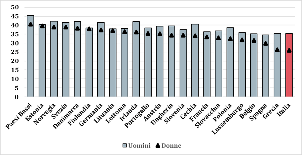 Una delle principali cause identificate nel report che spiega questo gap è la durata media della carriera lavorativa. Si stima infatti che la durata media della carriera delle donne sia 6 anni più breve rispetto a quella degli uomini, con conseguenze significative sugli assegni pensionistici. In Paesi come l’Italia, questo dato è ancora più problematico, con le carriere delle donne che durano 9 anni in meno rispetto a quelle degli uomini (Figura 2).