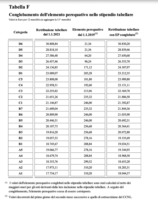 Distinguendo, quindi, in due periodi temporali precisi, per la quantificazione della spesa per gli stipendi tabellari del 2023, comprensivi dei ratei della tredicesima mensilità, gli enti, , per il periodo gennaio-marzo 2023, dovranno considerare le seguenti voci retributive: gli stipendi tabellari definiti per le ex categorie e posizioni economiche dall’art. 76, comma 3, indicati alla tabella F del CCNL Funzioni Locali 2019-2021, di seguito riportata, a cui si aggiungono i corrispondenti ratei della tredicesima mensilità (comprensivi, quindi, delle “posizioni economiche” e dell’elemento perequativo conglobato in godimento attribuiti sulla base di quanto previsto dai previgenti CCNL).